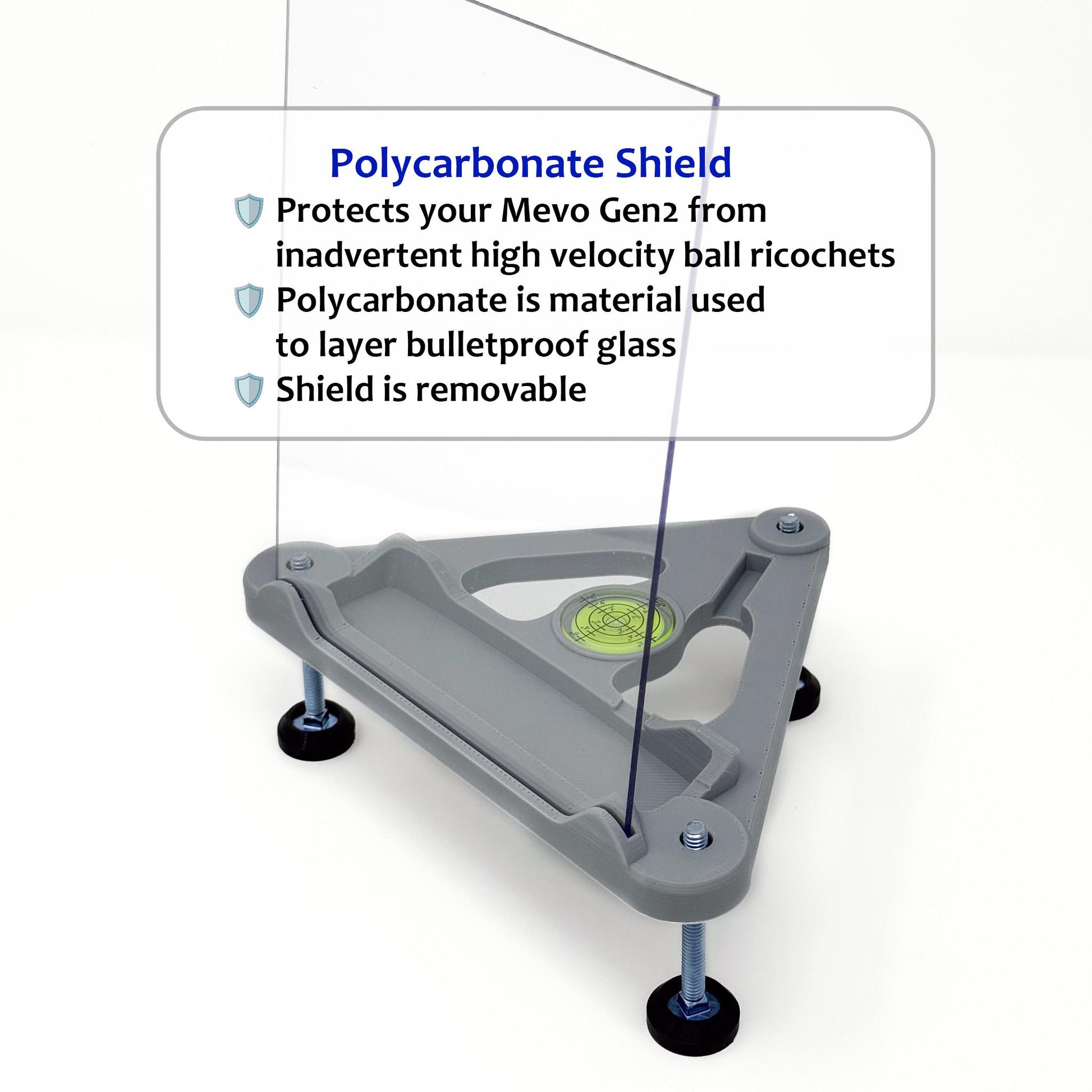 ⛳Removable Polycarbonate protective shield protects the front of the Mevo Gen2 from inadvertent high velocity ricocheting golf balls. Polycarbonate (sometimes referred to as Lexan) is the material used to layer bulletproof glass.