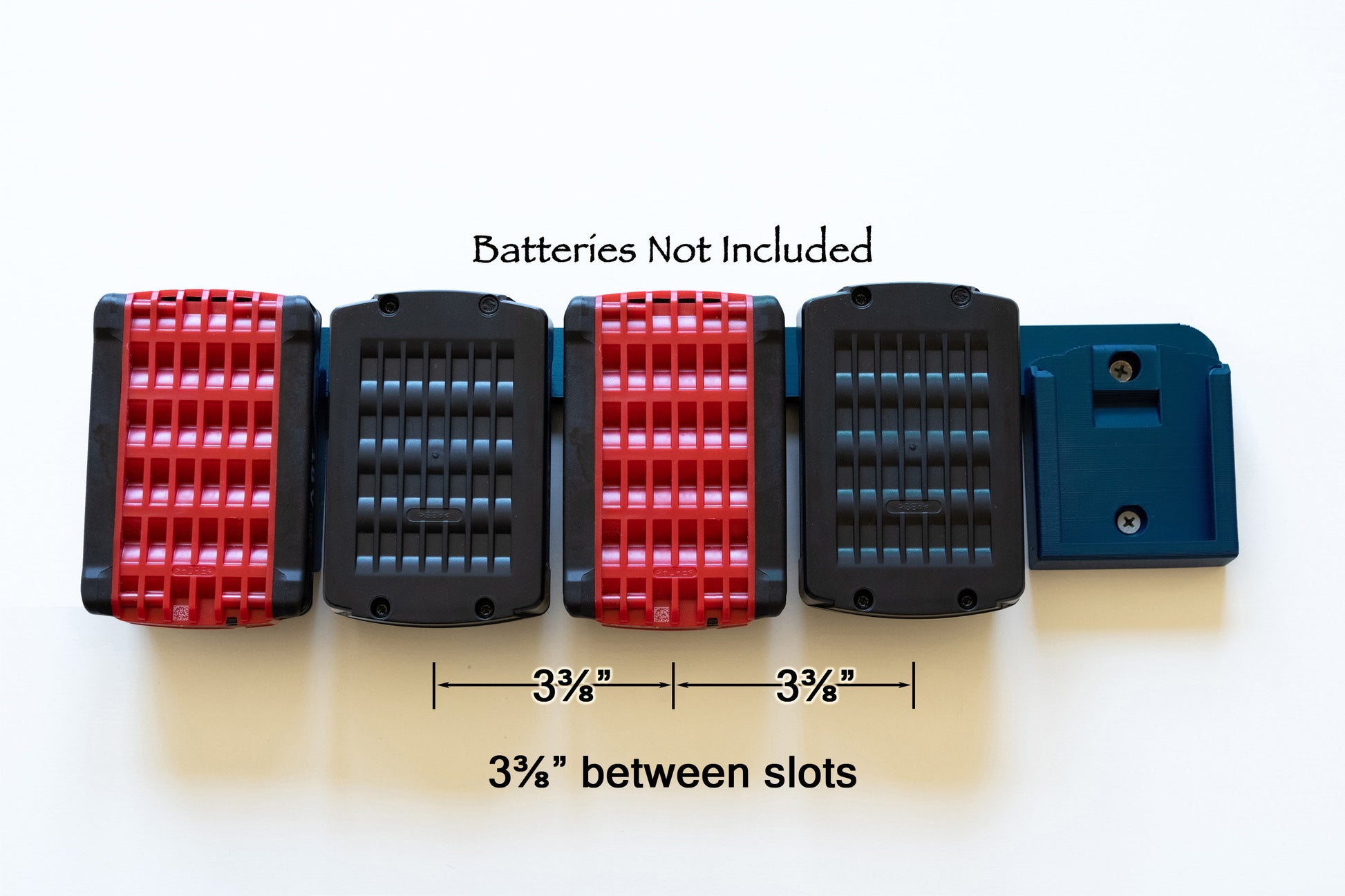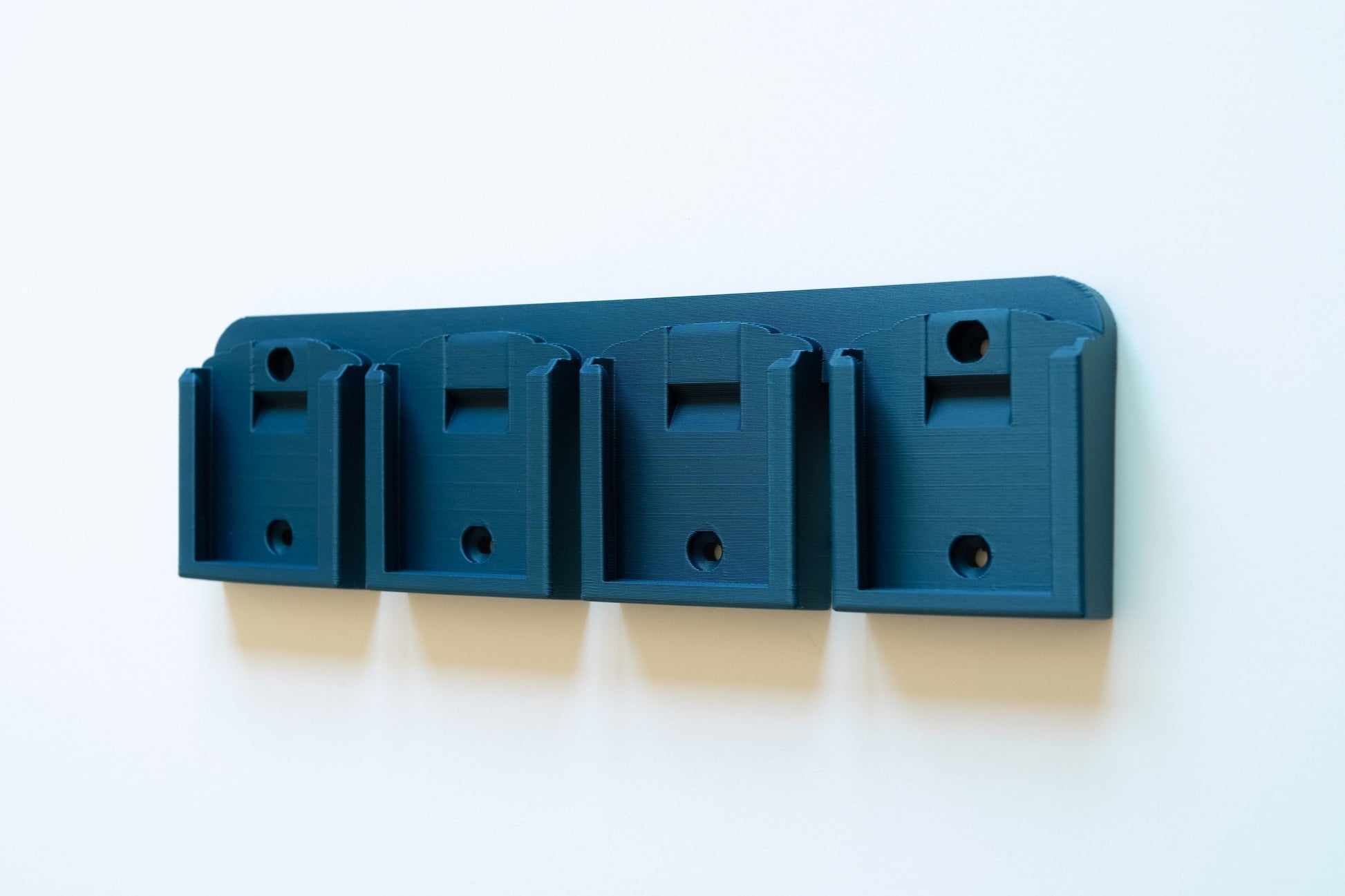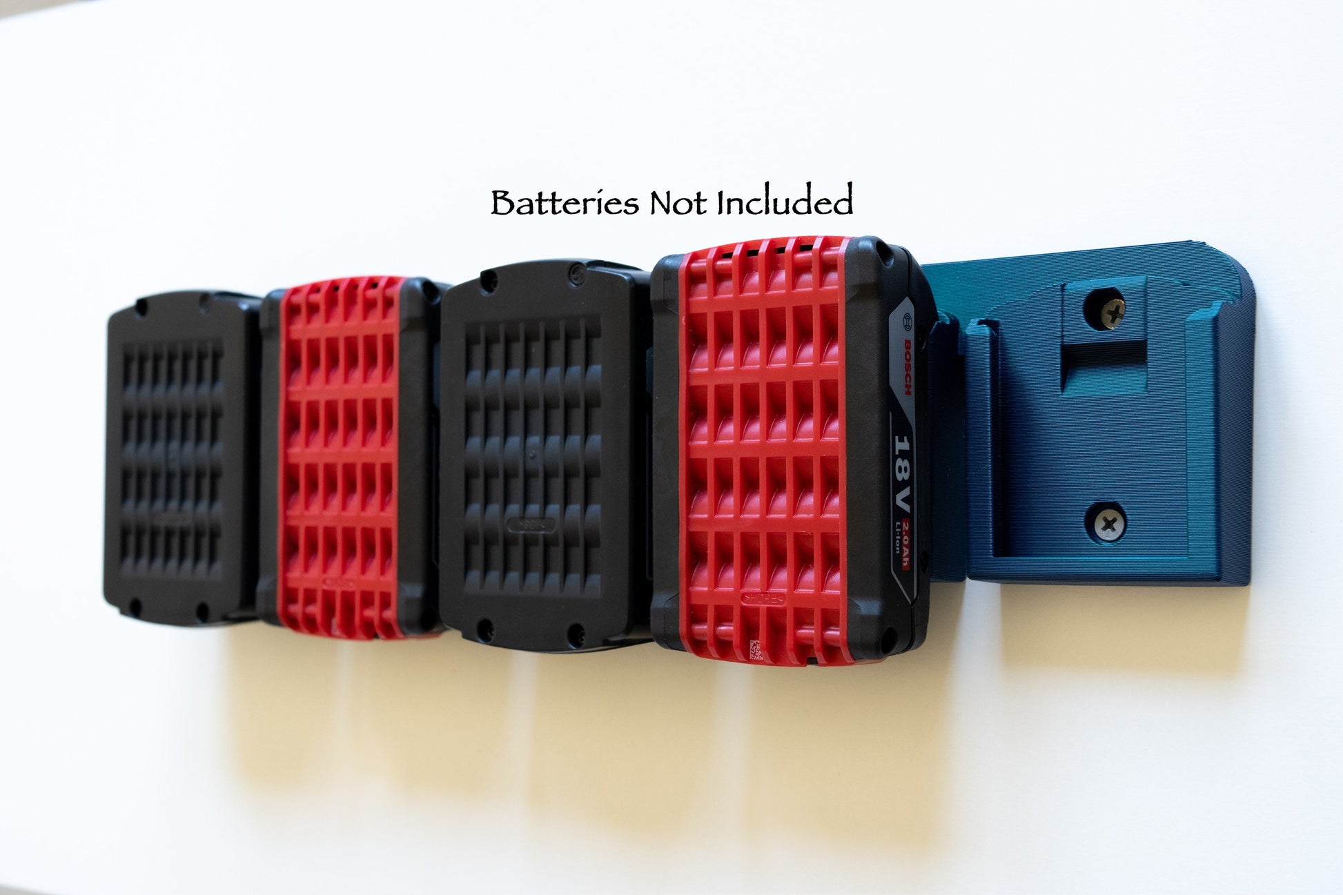 Organize and secure your Bosch 18v batteries with this custom-designed 3D-printed wall mount. Built for convenience and durability, this mount allows you to store your batteries neatly—on a wall, under a shelf, sideways, or even upside-down.